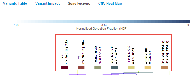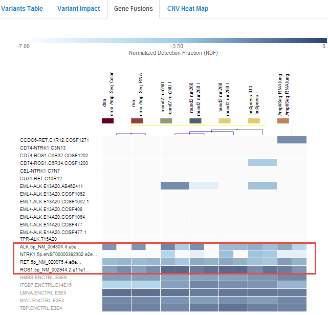 With heatmap visualizations, you can see the presence or absence of fusions in your samples, and you can compare the fusion calls across multiple analyses.