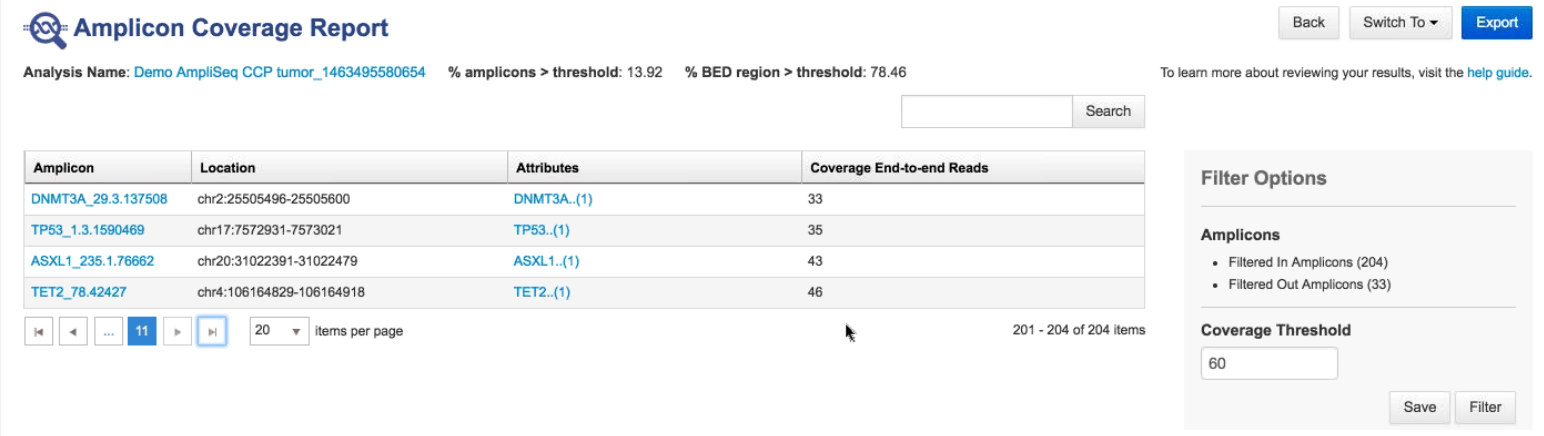 You can view an amplicon coverage report in Ion Reporter™ Software that shows which amplicons in an analysis do not have coverage. The report covers all bases to a user-defined coverage depth threshold. You can filter the list of amplicons that are shown in the report. The list is based on the threshold that you select and can adjust.