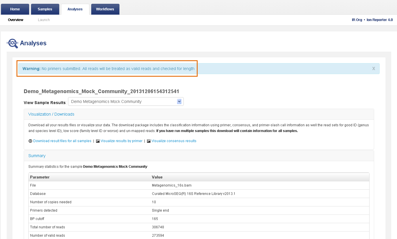 Note: When primer information is missing in the metagenomics analysis workflow, a warning message appears during analysis review.