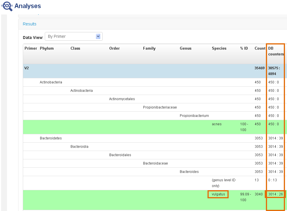For example, in the last row, for the species vulgatus, the value 3014:26 means that 3014 reads matched sequences in the MicroSEQ™ database and 26 matched sequences in the Greengenes database.