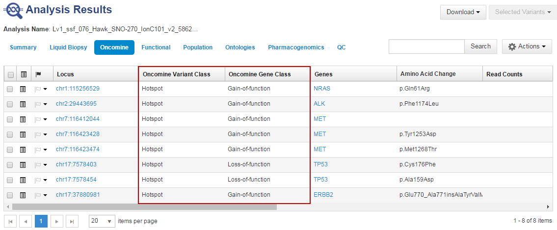- In the Oncomine tab, click the column headings to sort the list of variants by Oncomine Variant Class and Oncomine Gene Class.